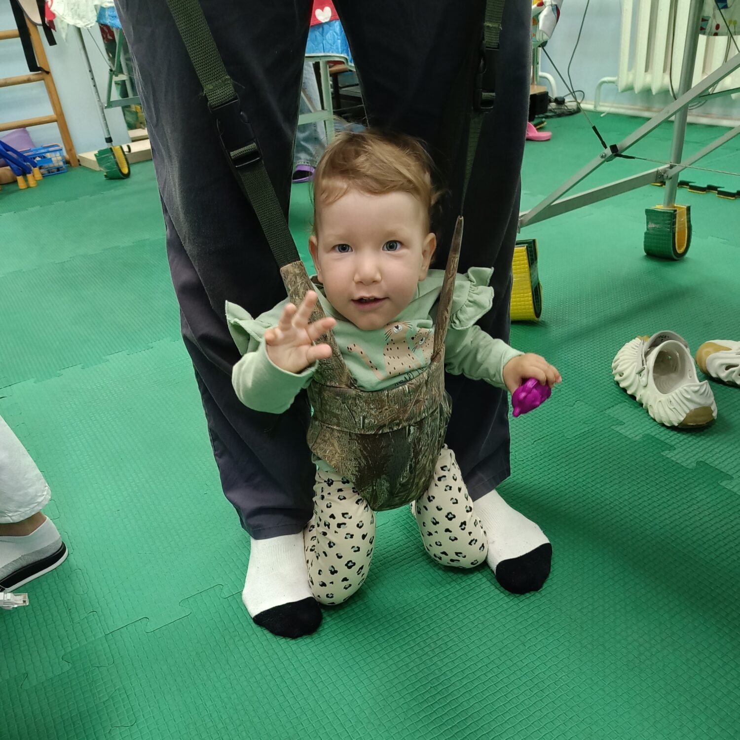 «Отпусти!» — настойчиво требует она и начинает плакать. «Евушка, как я тебя отпущу? Ты же еще не можешь ходить! Упадешь и будешь лежать…» — объясняет мама, но Алсу видит, как Ева старается изо всех сил достичь главной цели — встать на ноги. Несмотря на то что девочке всего два с половиной года, она почти сразу вливается в занятия, выполняет все, что говорят реабилитологи.